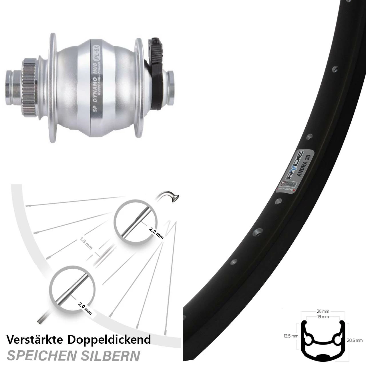 - Vorderrad 28 Zoll, 29 Zoll Ryde Andra 30 Disc schwarz mit Nabendynamo Shutter Precision PL-8X-M silbern