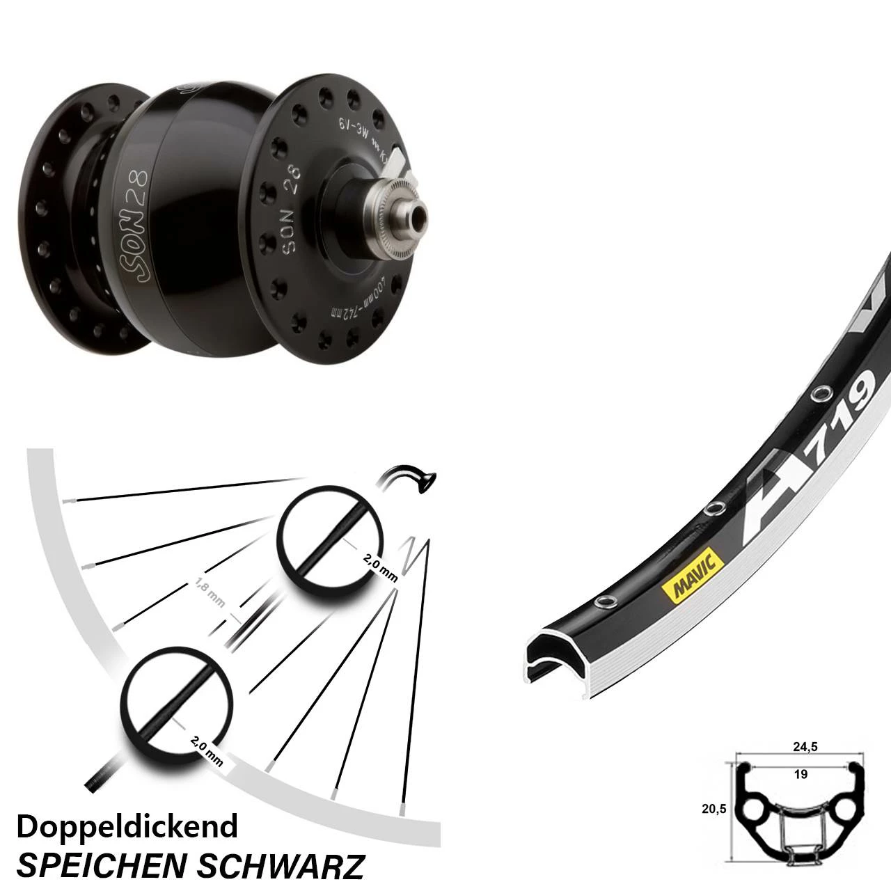 Technische Daten Vorderrad Mavic A 719 schwarz & Nabendynamo SON 28 Felgenbremse Hohlachse schwarz eloxiert