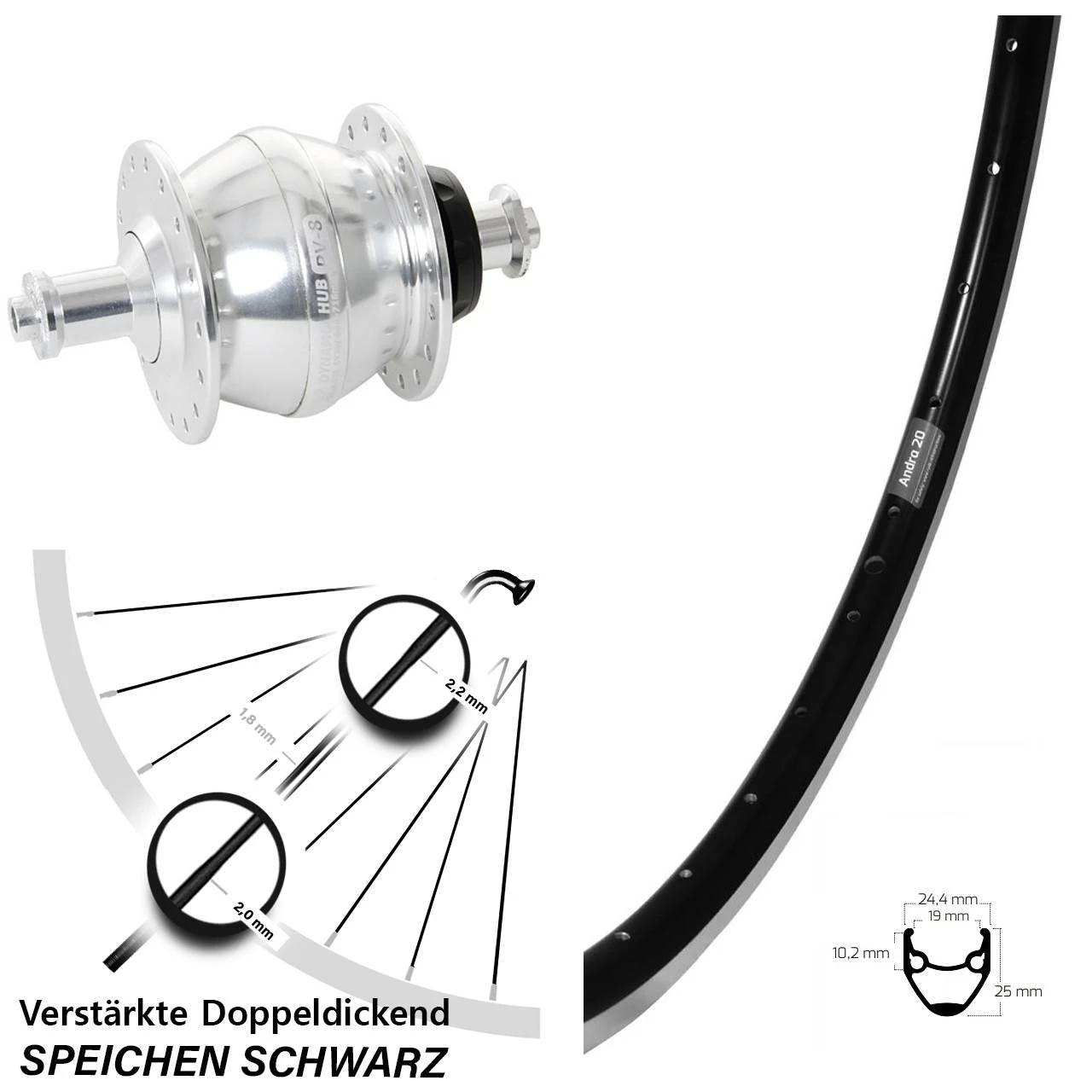 Technische Daten vorderes Laufrad Ryde Andra 20 Felgenbremse schwarz & Nabendynamo Shutter Precision PV-8 Felgenbremse silbern