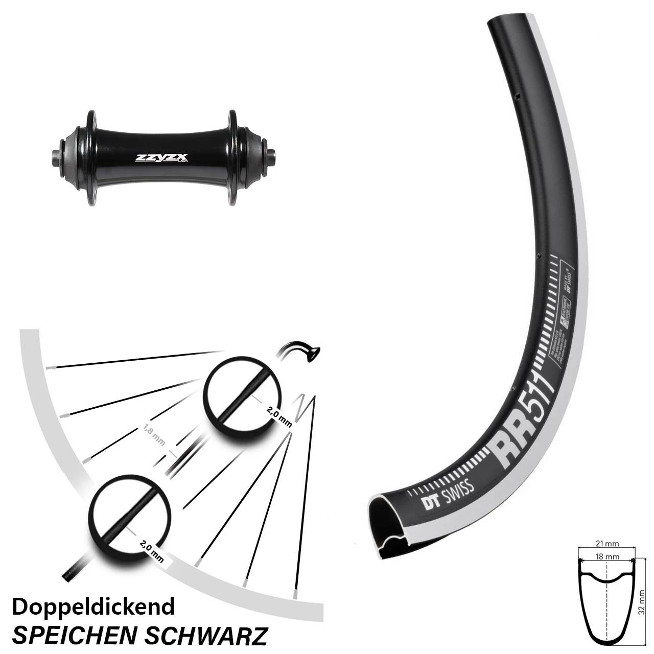 Technische Daten Vorderrad DT Swiss RR 511 RB Felgenbremse schwarz mit Nabe Formula ZZYZX VR RB-31 schwarz glänzend