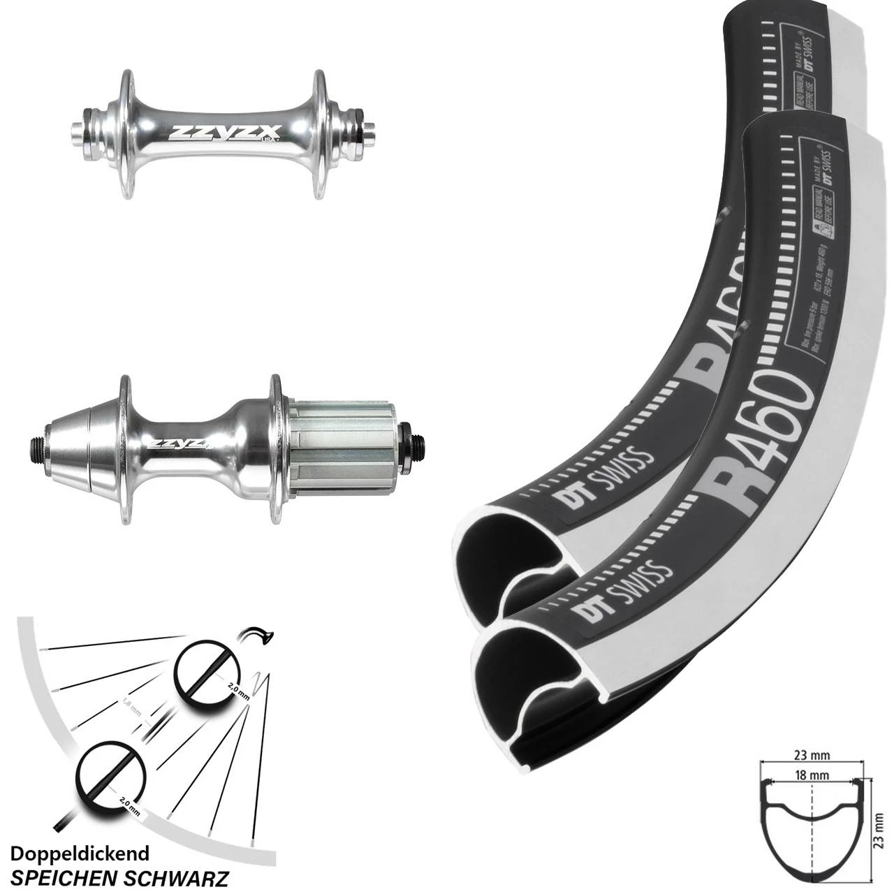 - 1 Laufrad 28 Zoll DT Swiss R 460 Formula ZZYZX VR RB-91S (Auswahl zwischen Messingnippel schwarz, Messingnippel silbern)