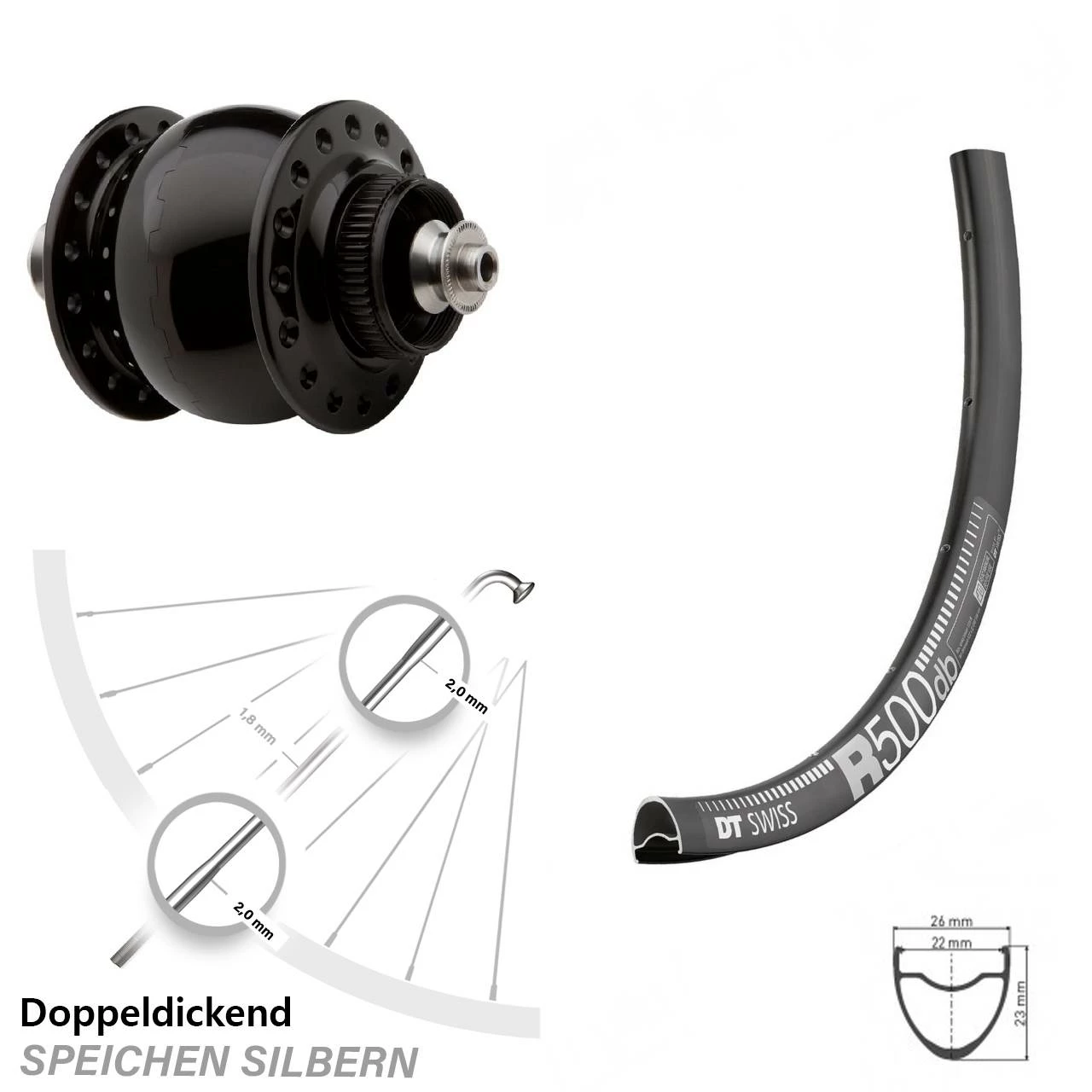Technische Daten Vorderrad DT Swiss R 500 DB Disc schwarz & Nabendynamo SON 28 Disc Centerlock Hohlachse schwarz eloxiert