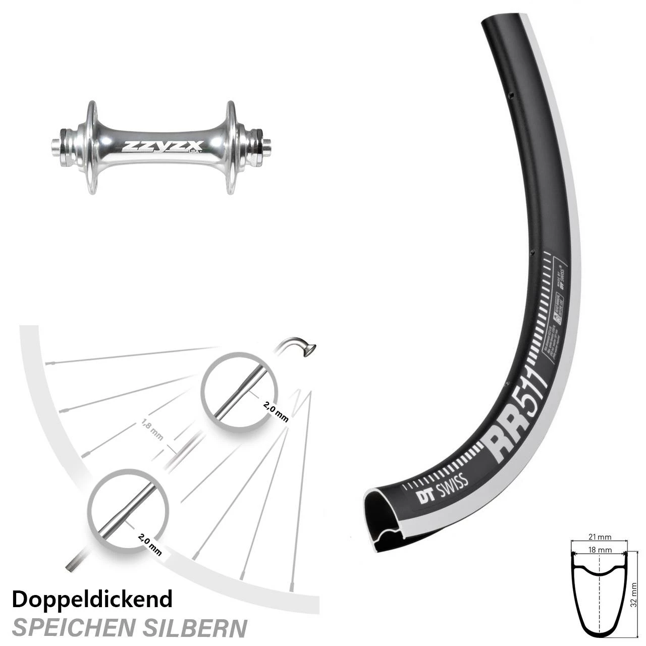 Technische Daten Vorderrad DT Swiss RR 511 RB Felgenbremse schwarz mit Nabe Formula ZZYZX VR RB-91S silbern