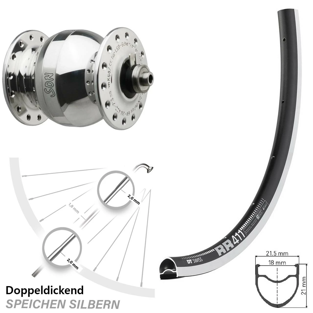 Dynamo Vorderrad SON delux Wide Body silben poliert DT Swiss RR 411 Felgenbremse mit Doppeldickendspeichen