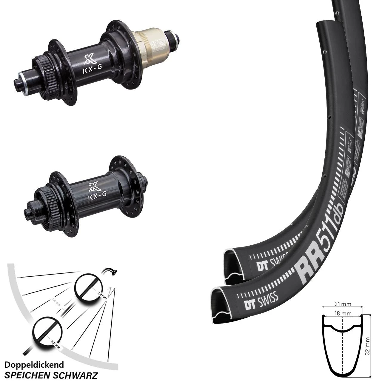 Genießen Sie die Vorzüge unserer durchdachten Fahrrad-Laufradsätze! Technisch und optisch bestmöglich zusammengestellt bieten unsere Laufrad-Sets ein hohes Maß an Zuverlässigkeit. Die 28 Zoll Felgen DT Swiss RR 511 DB kommen aus dem Hause DT Swiss und verfügen über eine solide Verarbeitung und eine langanhaltende Laufleistung. Passend dazu liefern wir Ihnen die stabilen schwarzen Naben KX-G Hinterradnabe 5/135 Centerlock SRAM XD-R, KX-G Vorderradnabe 5/100 Centerlock. 28 mit einer Stärke von 2,0-1,8-2,0 mm Edelstahl sorgen für eine hervorragende Stabilität. Dieses solide Set ist für Bikes mit Scheibenbremse geeignet. Alle Laufräder aus unserem Online Shop werden bereits komplett eingespeicht und zentriert an Sie ausgeliefert und sind an ihrem Bike sofort einbaubereit.
