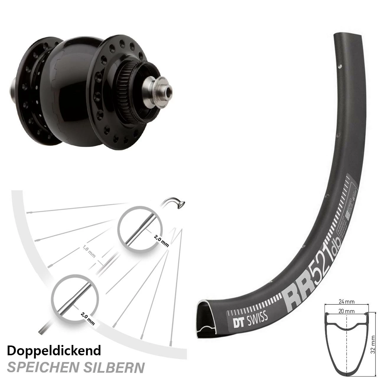 Technische Daten Vorderrad DT Swiss RR 521 DB schwarz & Nabendynamo SON 28 Disc Centerlock Hohlachse schwarz eloxiert
