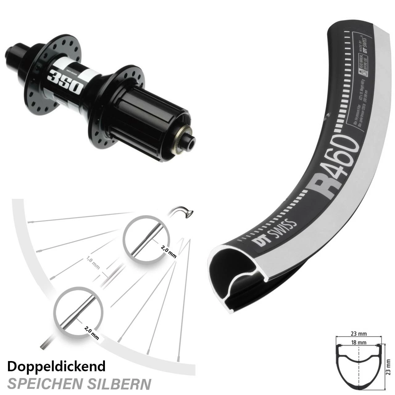 Technische Daten Hinterrad DT Swiss R 460 Felgenbremse schwarz und Nabe DT Swiss 350 Road Felgenbremse 5/130