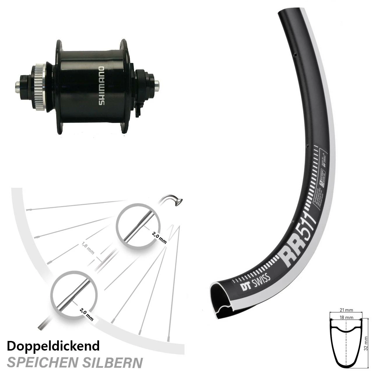 Mit der in schwarz gehaltenen Felge (Modell: DT Swiss RR 511 RB Felgenbremse schwarz) hat der Hersteller DT SWISS ein Fahrrad-Vorderrad auf den Markt gebracht, welches durch silberne Speichen und einen leichtläufigen Shimano Nabendynamo, für 5 mm Schnellspanner besticht. Nabendynamos sind effizient und sehr zuverlässig, da sie direkt in der Nabe des Vorderrades verbaut sind. Die Speichenanzahl beträgt 32. Dieses Komplett-Vorderrad mit 28 Zoll ist kompatibel mit allen gängigen Fahrrädern mit Felgenbremse und ist bereits komplett eingespeicht und zentriert.