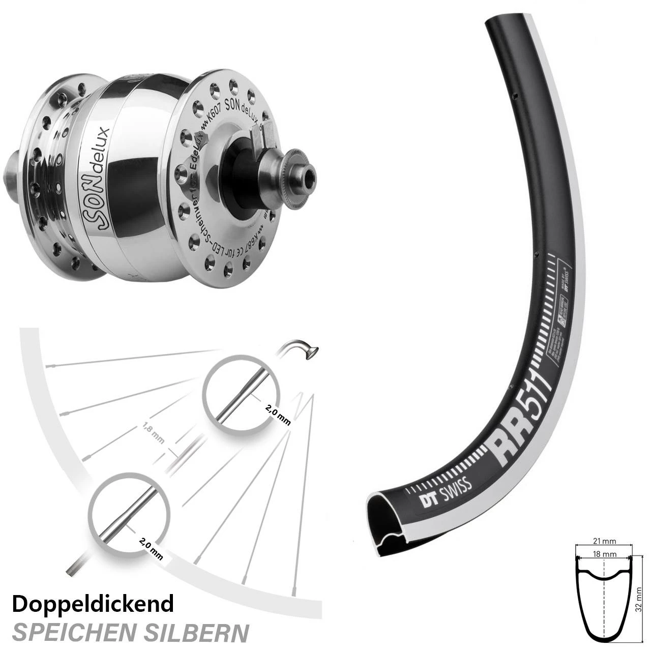 Produktbeschreibung Son delux silbern poliert DT Swiss RR 511 Fahrrad-Vorderrad mit Nabendynamo 28 Zoll