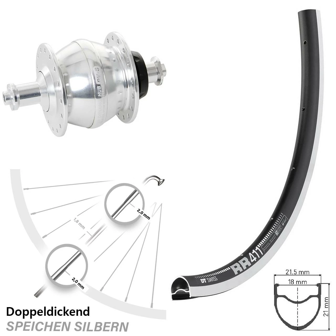 Technische Daten vorderes Laufrad DT Swiss RR 411 schwarz & Nabendynamo Shutter Precision PV-8 Felgenbremse silbern