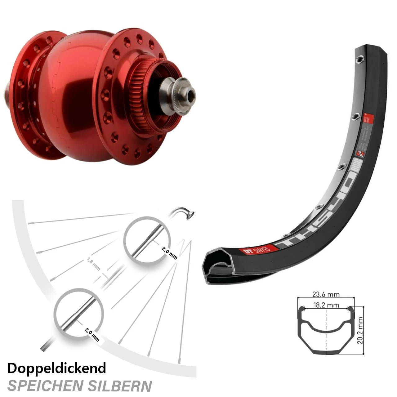 - Vorderrad 28 Zoll, 29 Zoll DT Swiss TK 540 schwarz mit Nabendynamo SON 28 rot