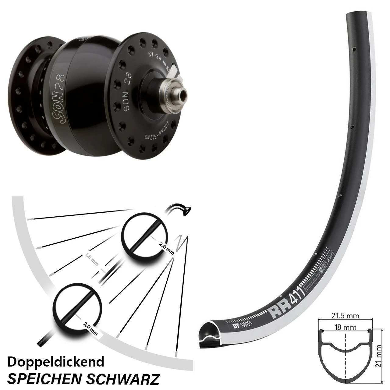 - Vorderrad 28 Zoll DT Swiss RR 411 schwarz mit Nabendynamo SON 28 schwarz
