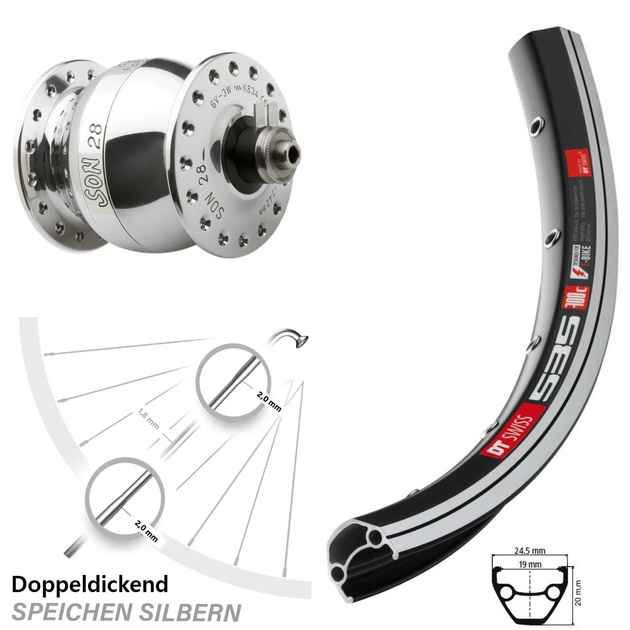 Technische Daten Vorderrad DT Swiss 535 Felgenbremse schwarz & Nabendynamo SON 28 Felgenbremse Hohlachse silbern poliert