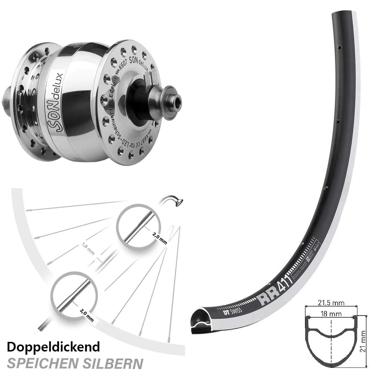 Technische Daten Vorderrad DT Swiss RR 411 schwarz & Nabendynamo SON delux Felgenbremse Hohlachse silbern poliert