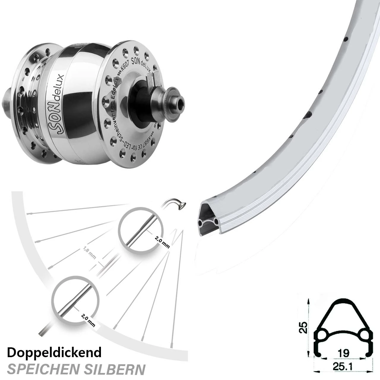 Produktbeschreibung Fahrrad Nabendynamolaufrad Son delux silbern poliert Rodi Airline 28 Zoll