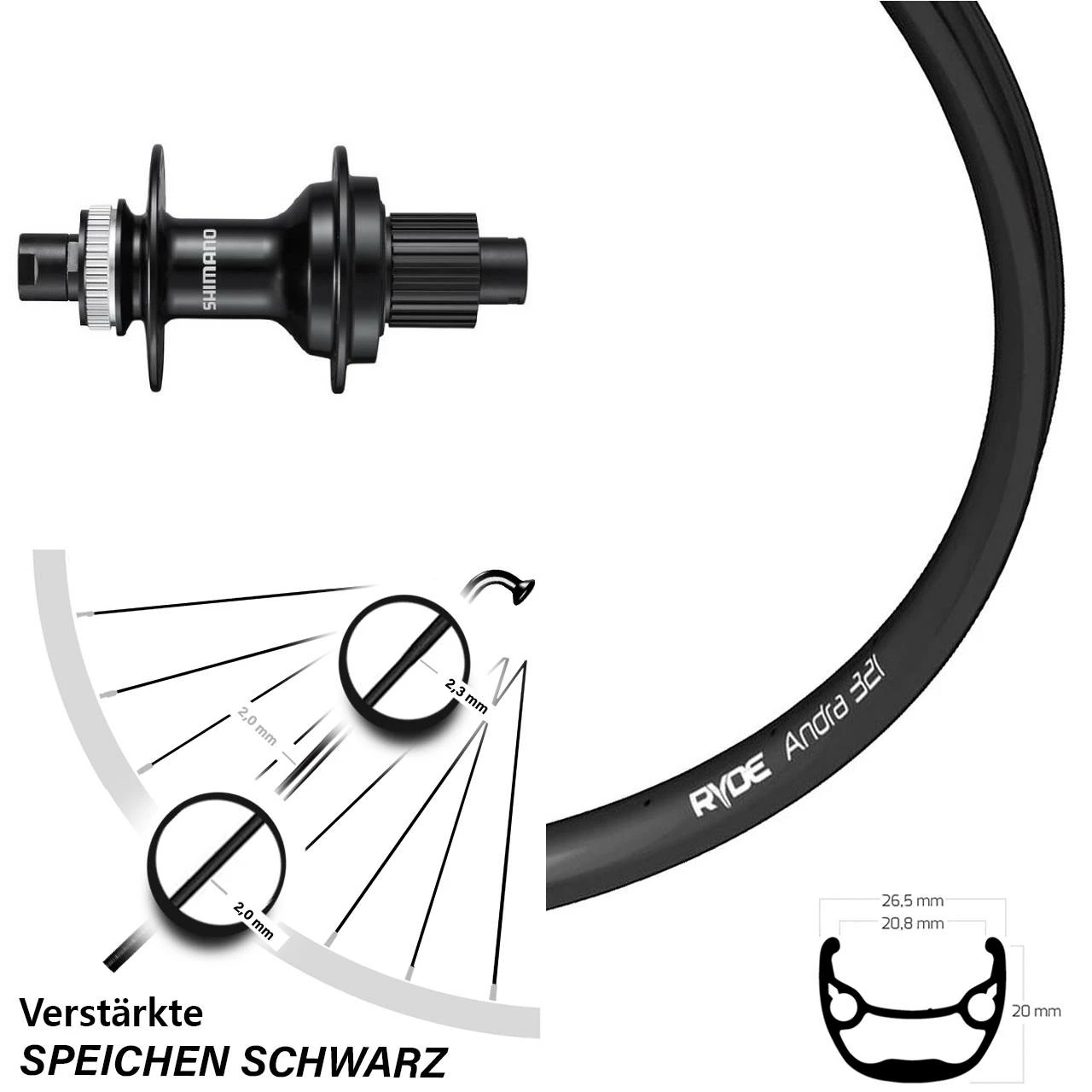 Technische Daten Hinterrad Ryde Andra 321 Disc schwarz und Nabe Shimano FH-MT510 schwarz