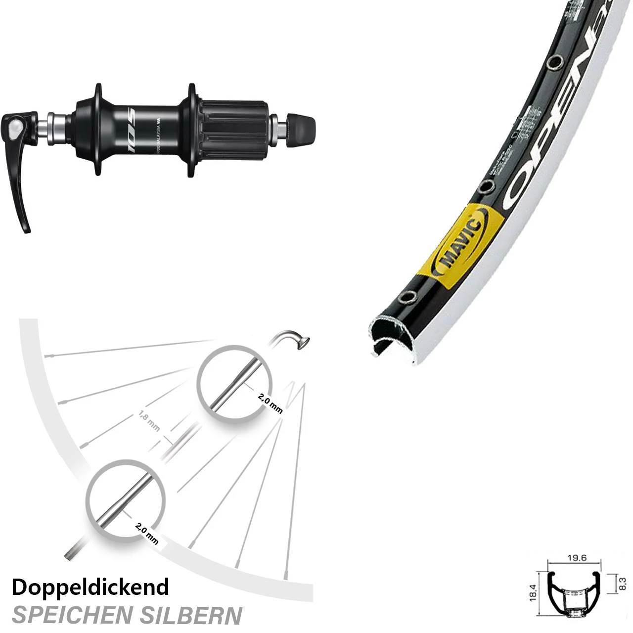 Technische Daten Hinterrad Mavic Open Pro SUP schwarz und Nabe Shimano FH-R7000 schwarz