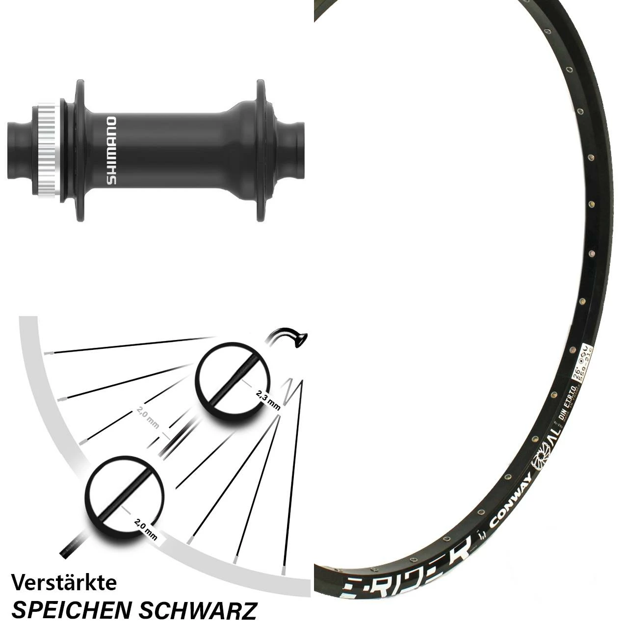 Das Vorderrad mit 26 Zoll Zoll Größe verfügt über 100 mm Einbaubreite, eine ETRTO Größe von 21-559 mm und wird im Lastenrad Bereich eingesetzt. Es verfügt über eine Ventillochbohrung von 8,5 mm und lässt sich an Fahrräder mit Centerlock Scheibenbremsen einbauen. Es sind eine schwarze Shimano HB-MT410 schwarz Nabe und die schwarze Mach 1 Magma Disc Felge in das Vorderrad eingebaut. Diese verleihen ihm die nötige Stabilität für Touren auf ebenen Strecken, sowie auch im Gelände. Das maximal zugelassene Systemgewicht liegt bei bis zu 150 kg. Sie können das robuste vordere Laufrad bei uns mit 32 schwarzen Speichen bestellen, um Ihr Bike ideal auszubauen! Der Einsatz erfolgt im Lastenrad Bereich.