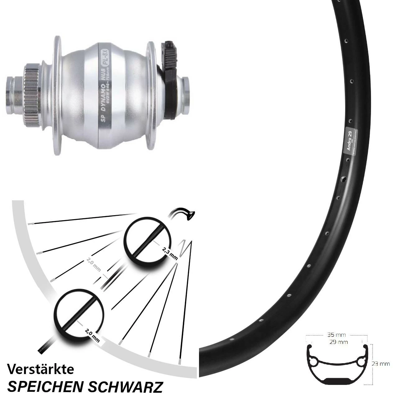 - Vorderrad 29 Zoll, 29+ Zoll Ryde Andra 29 schwarz mit Nabendynamo Shutter Precision PL-8X-M silbern