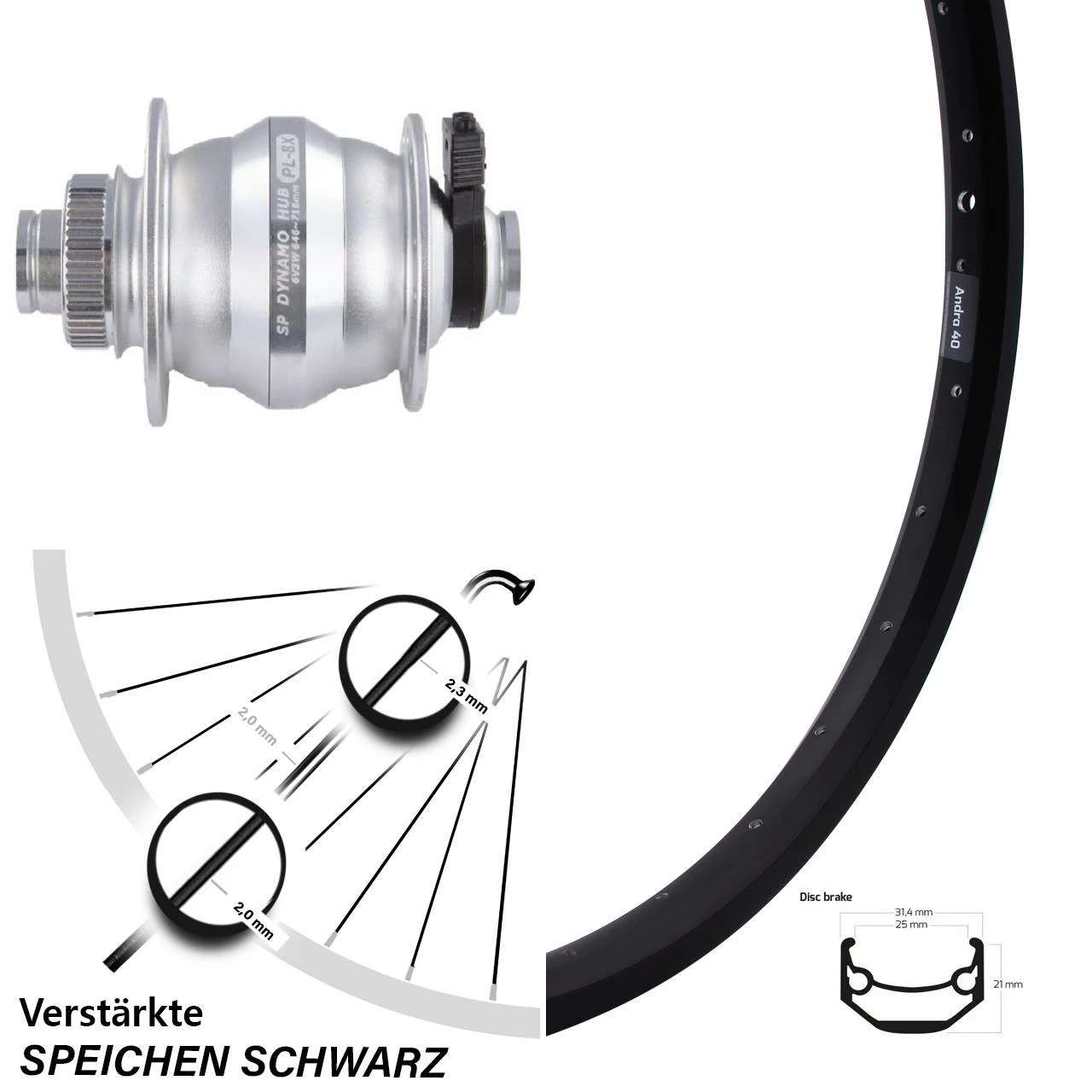 Technische Daten vorderes Laufrad Ryde Andra 40 Disc schwarz & Nabendynamo Shutter Precision PL-8X-M Disc Centerlock silbern