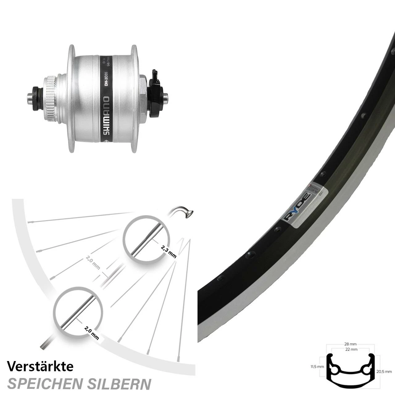 Mit der in schwarz gehaltenen Felge (Modell: Ryde Andra 35 Felgenbremse schwarz) hat der Hersteller Ryde ein Fahrrad-Vorderrad auf den Markt gebracht, welches durch silberne Speichen und einen stromsparenden Shimano Nabendynamo, für 5 mm Schnellspanner besticht. Nabendynamos sind leichtgängig und sehr widerstandsfähig, da sie direkt in der Nabe des Vorderrades verbaut sind. Die Speichenanzahl beträgt 36. Dieses Komplett-Vorderrad mit 28 Zoll ist kompatibel mit allen gängigen Fahrrädern mit Felgenbremse und ist bereits komplett eingespeicht und zentriert.