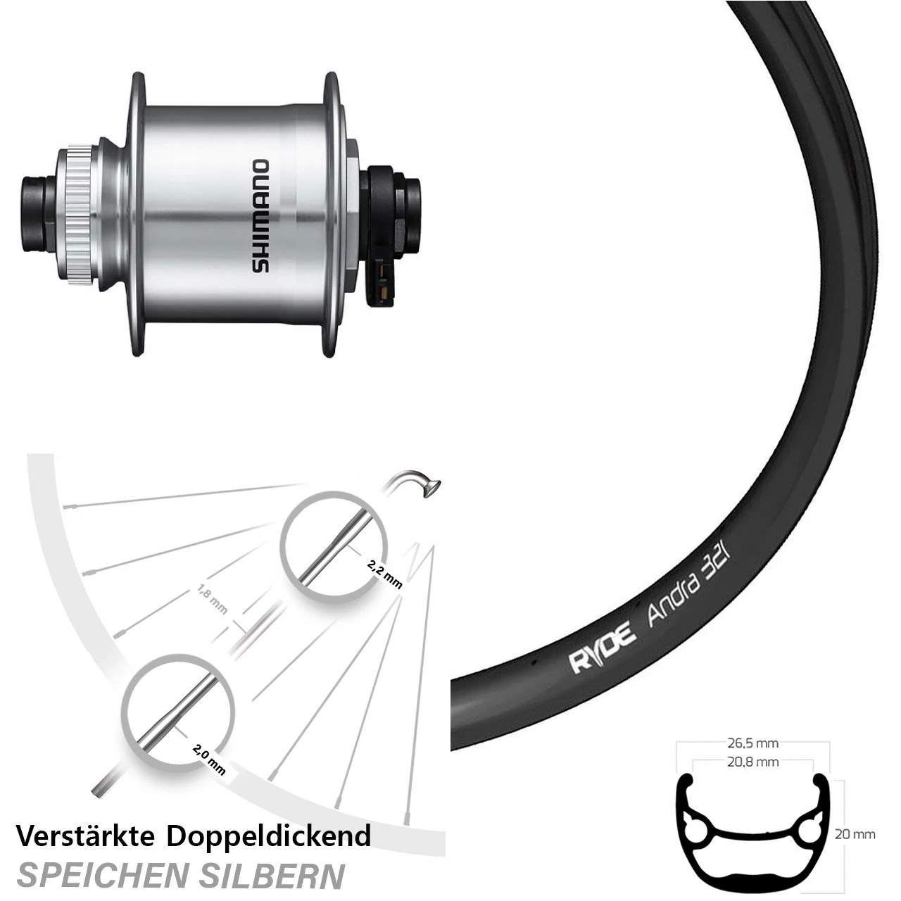 Nabendynamolaufrad Shimano DH-UR705-3D Ryde Andra 321 28 Zolll Centerlock Steckachse mit verstärkten Doppeldickendspeichen