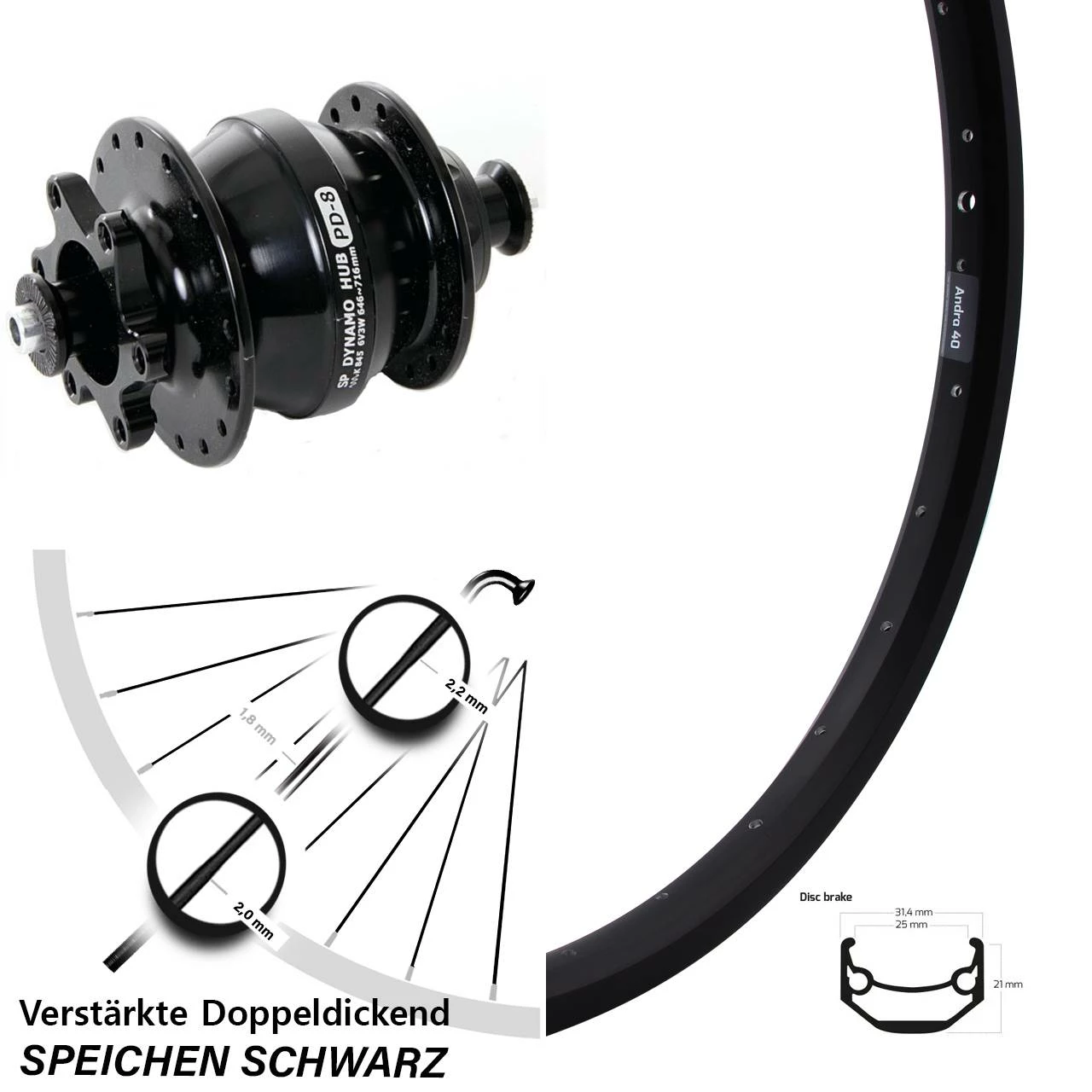 Technische Daten vorderes Laufrad Ryde Andra 40 Disc schwarz & Nabendynamo Shutter Precision PD-8 Disc 6-Loch schwarz