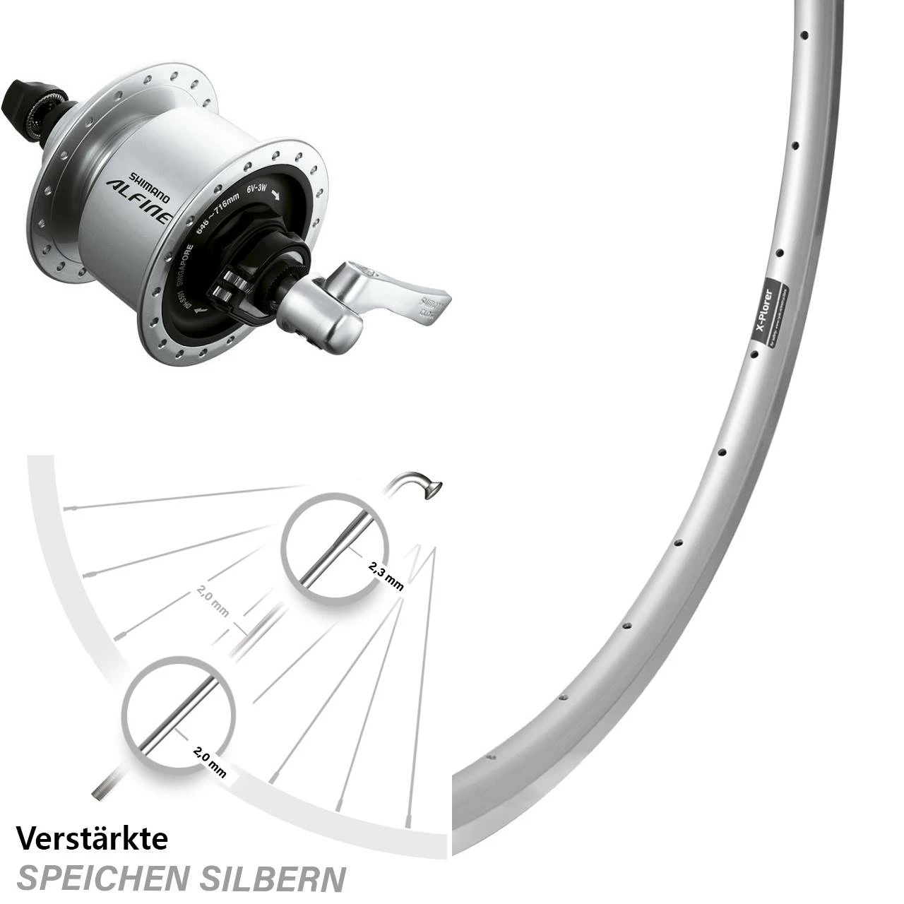 Technische Daten vorderes Laufrad Ryde X-Plorer silbern & Nabendynamo Shimano DH-S501 silbern