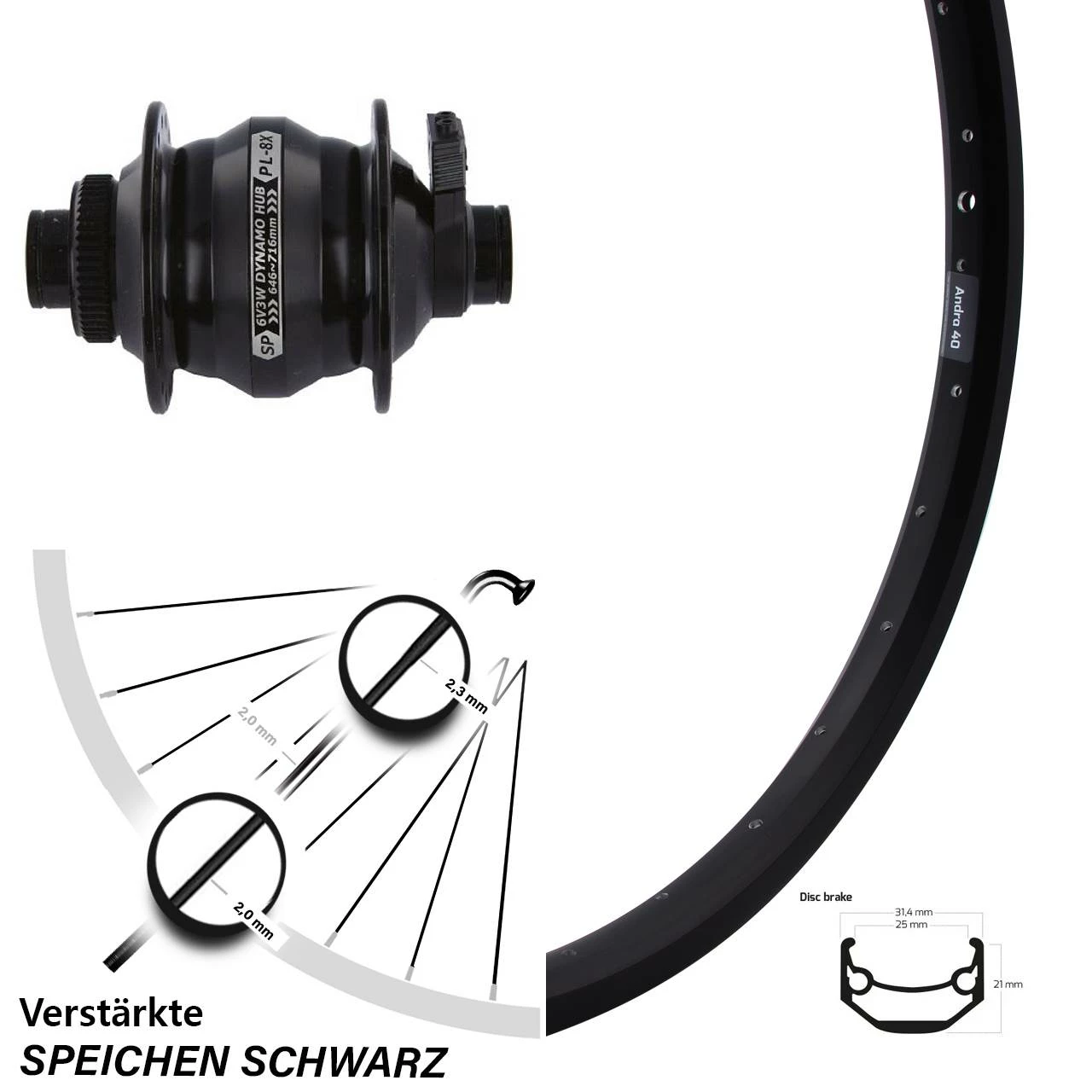Technische Daten vorderes Laufrad Ryde Andra 40 Disc schwarz & Nabendynamo Shutter Precision PL-8X Disc Centerlock schwarz