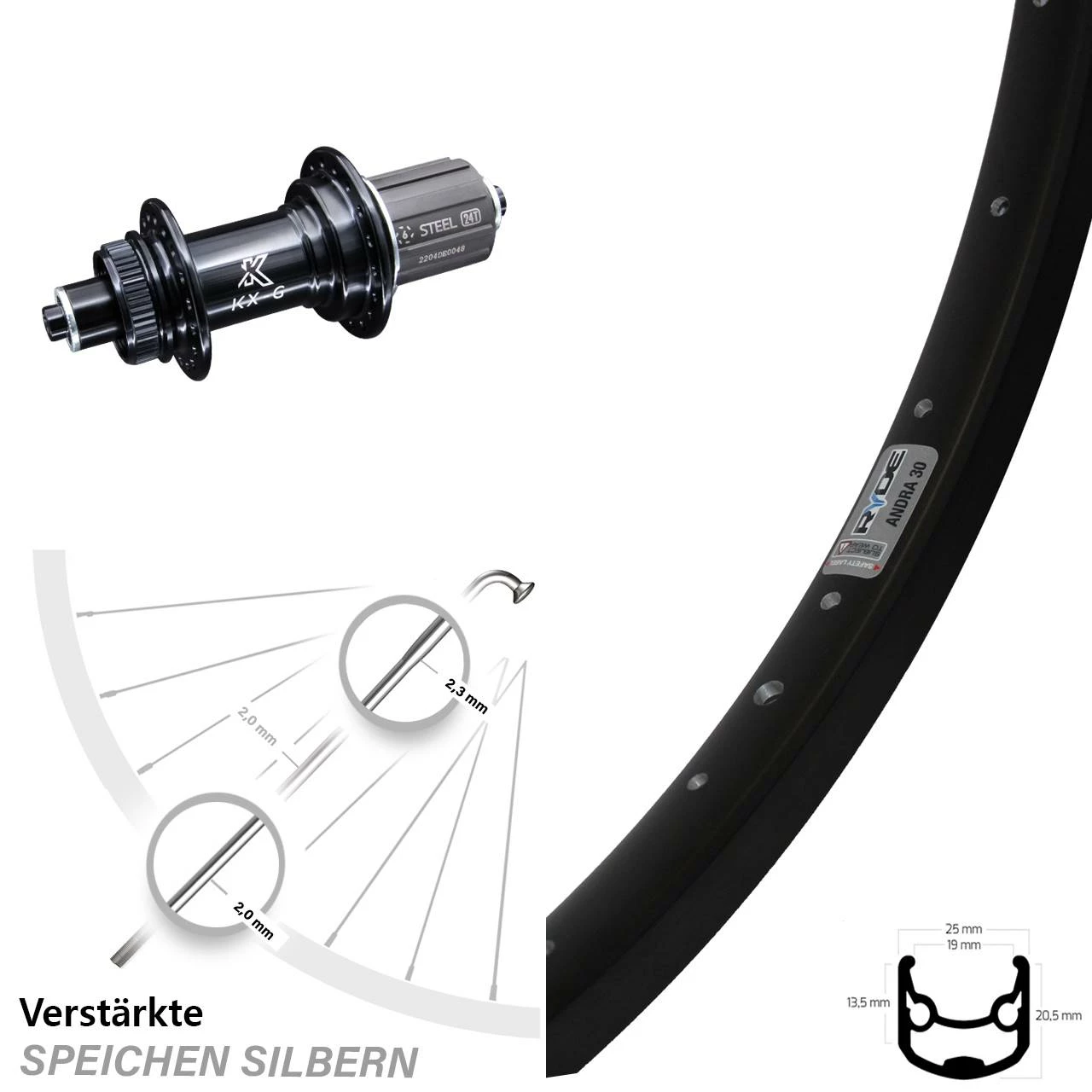 Ryde Andra 30 Disc Hinterrad 26 Zoll mit KX-GS Centerlock Nabe mit verstärkten Speichen