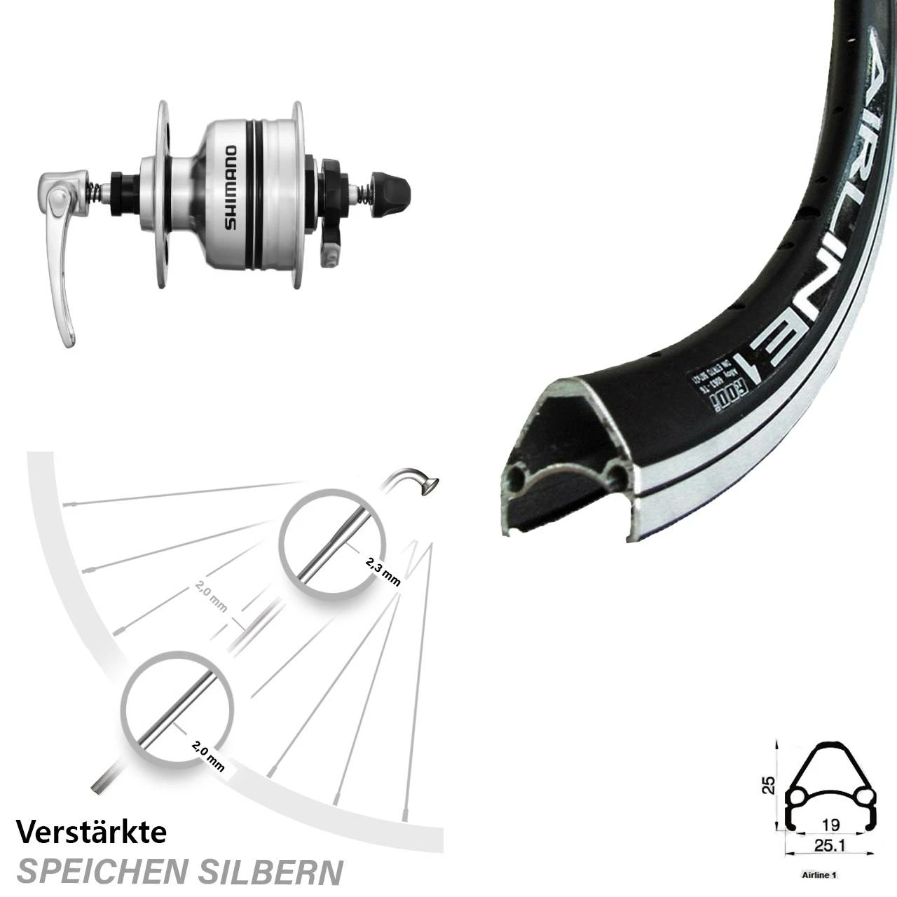 Produktbeschreibung Shimano DH3N80 Nabendynamo Rodi Airline Fahrrad-Vorderrad 28 Zoll