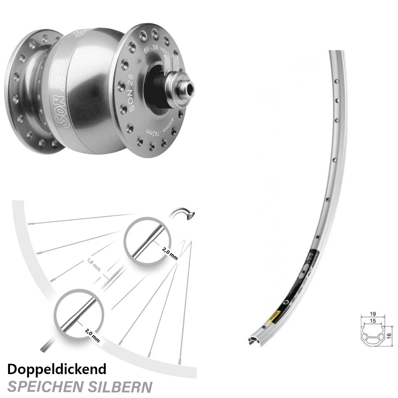 Technische Daten Vorderrad Mavic Open Elite silbern & Nabendynamo SON 28 Felgenbremse Hohlachse silbern eloxiert