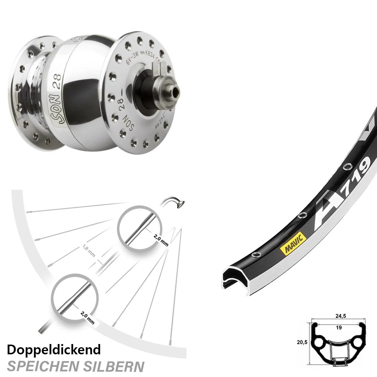 Technische Daten Vorderrad Mavic A 719 schwarz & Nabendynamo SON 28 Felgenbremse Hohlachse silbern poliert
