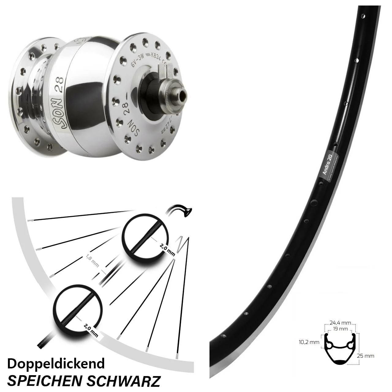 Technische Daten Vorderrad Ryde Andra 20 Felgenbremse schwarz & Nabendynamo SON 28 Felgenbremse Hohlachse silbern poliert