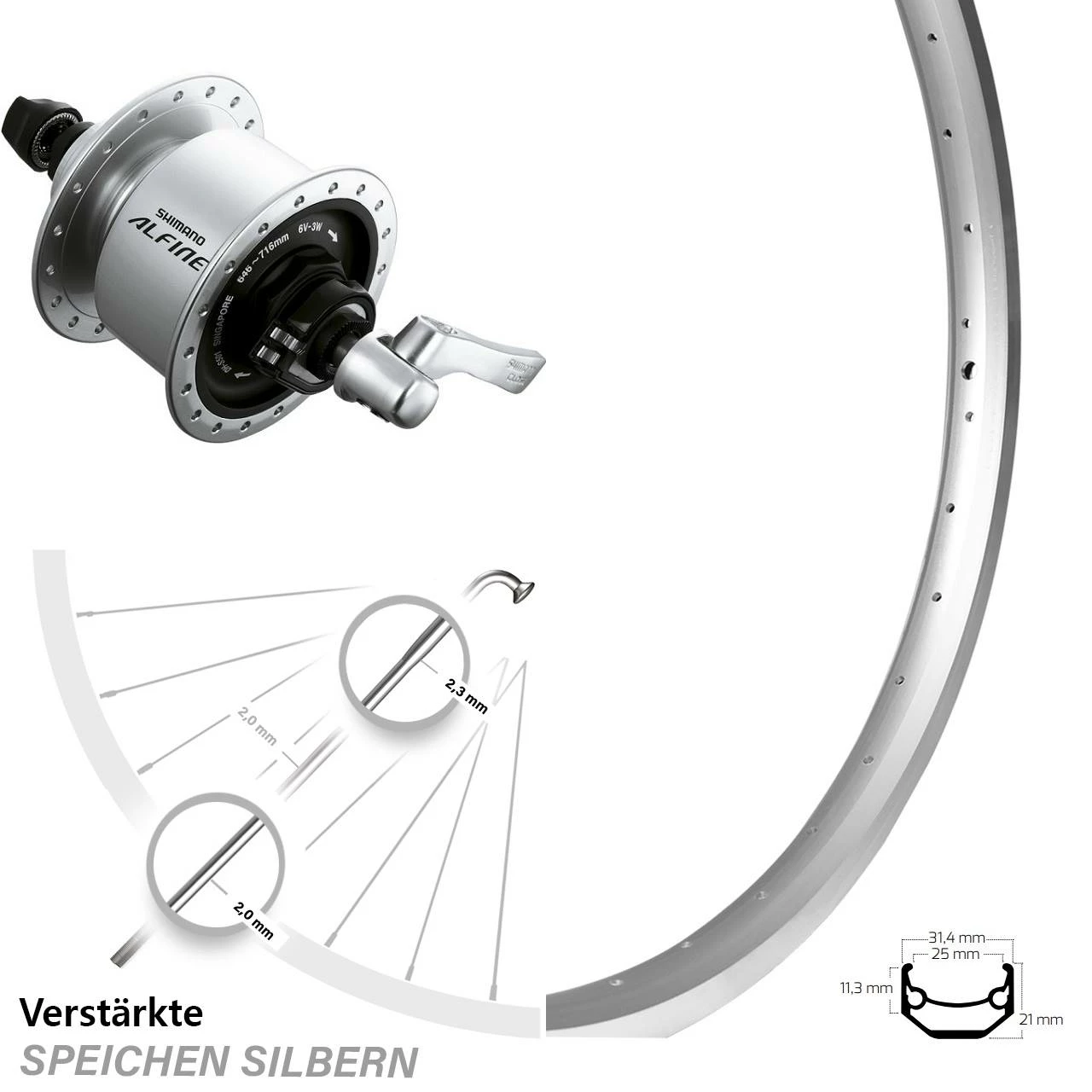 Vorderrad 24 Zoll Shimano Alfine DH-S501 Nabendynamo Ryde Andra 40 silbern mit verstärkten Speichen