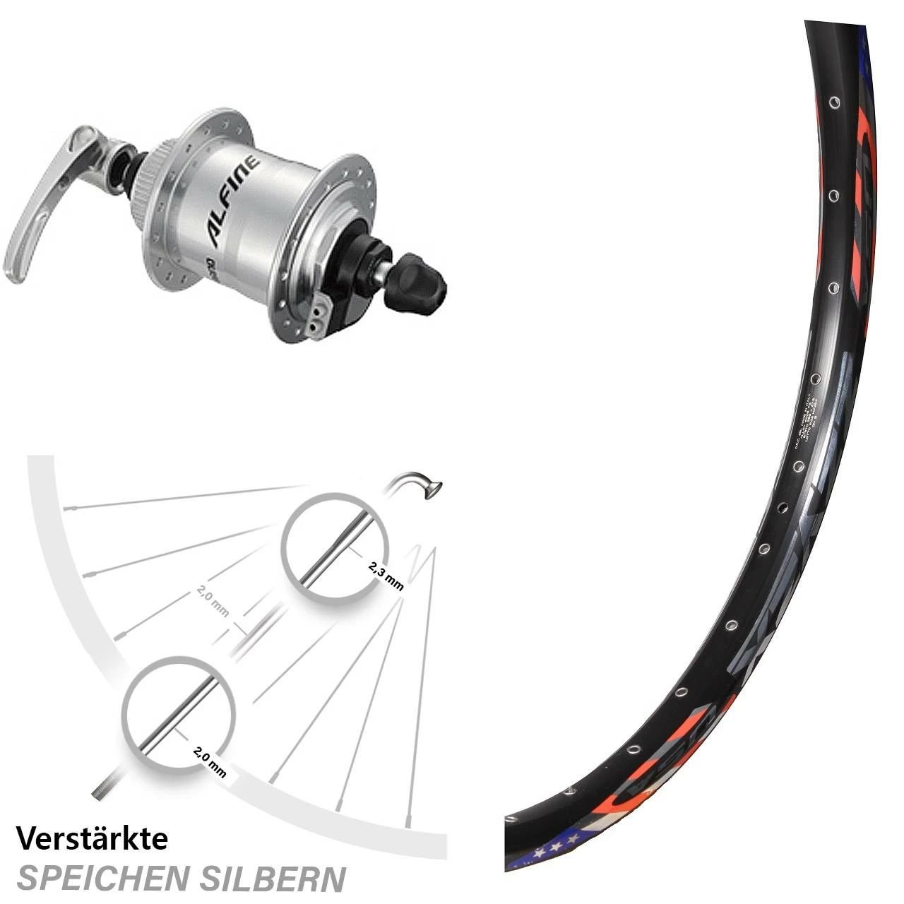 - 36 silberne Sapim Speichen mit Speichenstärke 2,34/2,0 mm Edelstahl verstärkt – besonders stabile und verstärkte Dickendspeiche mit 2,34 mm Durchmesser im kritischen Bereich der Nabe