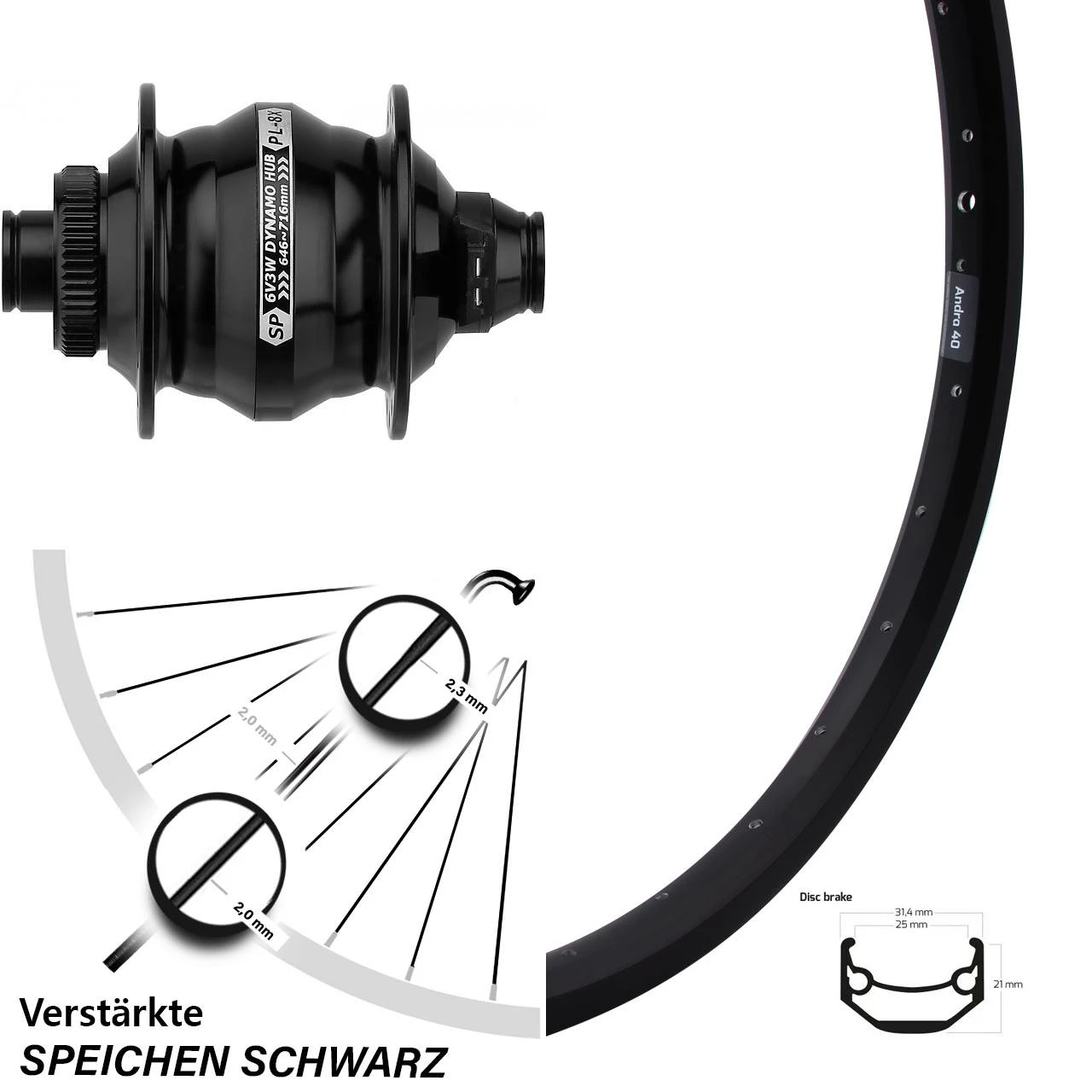 - Vorderrad 20 Zoll Ryde Andra 40 Disc schwarz mit Nabendynamo Shutter Precision PL-8X-M schwarz